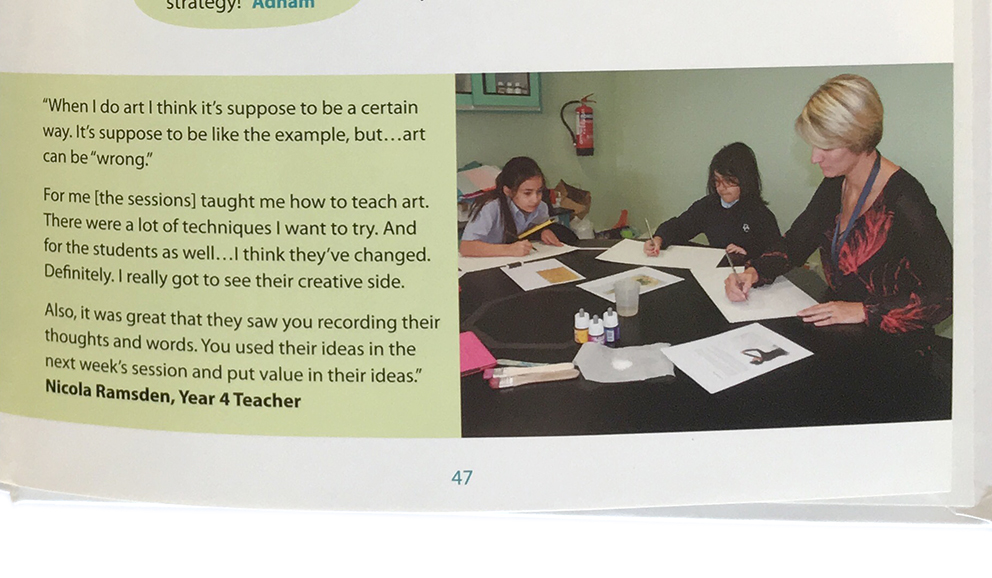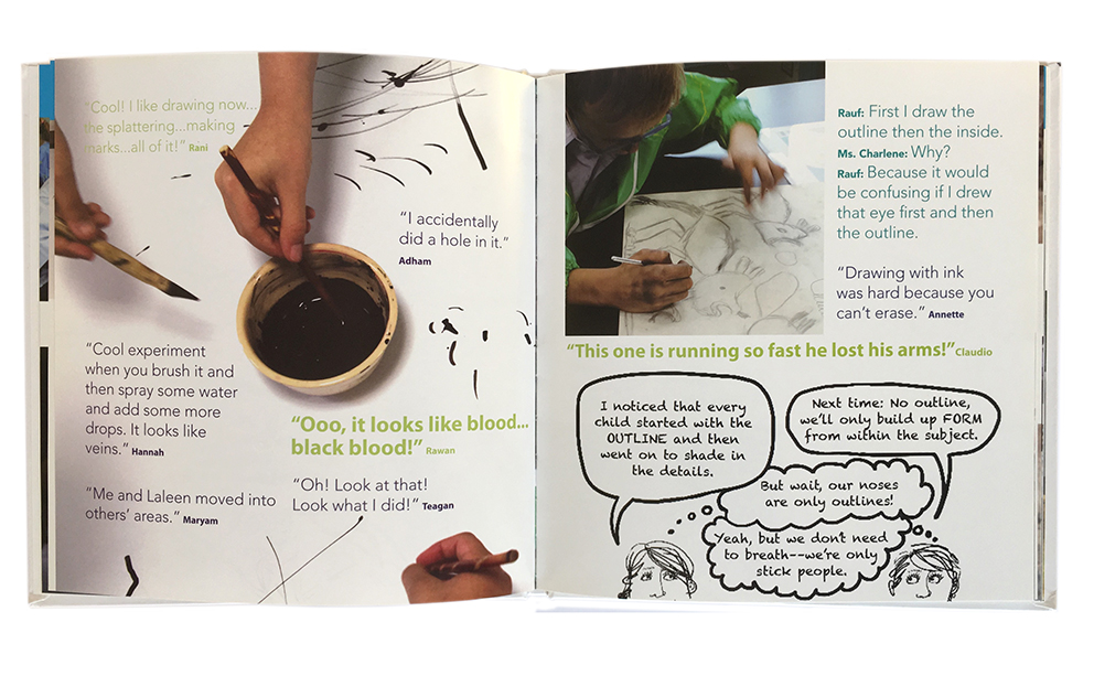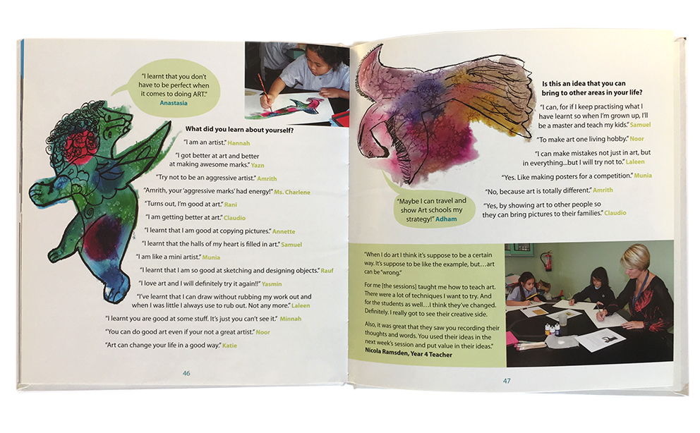 I was granted the flexibility to design the book below to summarise the collaboration; it features photos, quotes, and reflections of/from the students. To close the project, the students shared their learning and artistic process with their families and community of teachers.